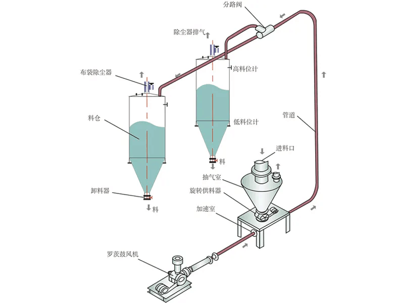 氣力輸送系統(tǒng)的工作原理是,利用羅茨風機產生的正壓氣流作為輸送動力,帶動物料在氣力輸送管道內運輸,從而確保物料能順利到達后續(xù)的儲料倉中.
