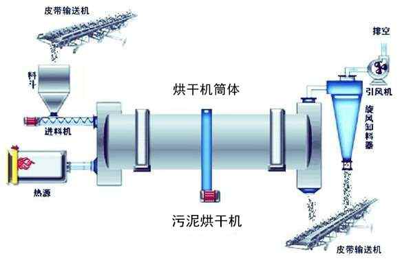 污泥由給料機(jī)經(jīng)溜槽進(jìn)入污泥烘干機(jī)內(nèi)導(dǎo)料板上,隨著筒體的轉(zhuǎn)動(dòng),污泥被導(dǎo)至傾斜揚(yáng)料板上即被提升到筒體的中心位置,逐漸灑落形成料幕,高溫氣流從中 穿過(guò),使污泥預(yù)熱并蒸發(fā)部分水分。當(dāng)污泥灑落、移動(dòng)到活動(dòng)的篦條式翼板上時(shí),物料又與預(yù)熱過(guò)的篦條式翼板夾雜在一起,將熱量傳給物料,使部分水分蒸發(fā)。同時(shí),翼板夾帶物料提起、灑落,重復(fù)多次,物料與熱氣流進(jìn)行對(duì)流和接觸熱交換。同時(shí)埋在物料中的清掃裝置,也沿圓弧形揚(yáng)料板的里側(cè)下滑,把揚(yáng)料板內(nèi)壁粘附的 物料清掃下來(lái)。當(dāng)清掃裝置隨筒體轉(zhuǎn)過(guò)垂直線以后,又在圓弧揚(yáng)料板背面拖動(dòng),將其粘附在揚(yáng)料板外壁的物料清掃下來(lái)。隨著污泥烘干機(jī)筒體的不斷轉(zhuǎn)動(dòng),使部分水 分蒸發(fā),污泥得到進(jìn)一步干燥。同時(shí),清掃裝置對(duì)污泥團(tuán)球也起到了打碎作用,提高了干燥速度,后污泥干燥后變成低水分的松散物料,由污泥烘干機(jī)出料口排出。